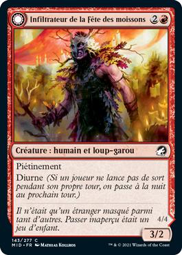 • Infiltrateur de la Fête des moissons -> Assaillant de la Fête des moissons - Innistrad : Chasse de Minuit (Commune) Infiltrateur de la Fête des moissons -> Assaillant de la Fête des moissons - Innistrad : Chasse de Minuit (Commune)