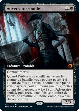 autant de fois que vous le souhaitez. Quand vous payez ce coût au moins une fois, mettez autant de marqueurs +1/+1 sur l'Adversaire souillé, puis créez deux fois ce nombre de jetons de créature 2/2 noire Zombie avec la décomposition.