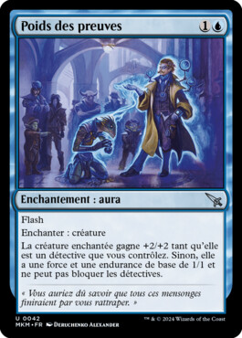 Flash Enchanter : créature La créature enchantée gagne +2/+2 tant qu'elle est un détective que vous contrôlez. Sinon, elle a une force et une endurance de base de 1/1 et ne peut pas bloquer les détectives.