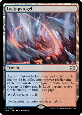 • Au moment où le Lacis pyrogel arrive sur le champ de bataille, vous pouvez révéler une carte d'île ou de montagne de votre main. Si vous ne le faites pas, le Lacis pyrogel arrive sur le champ de bataille engagé.