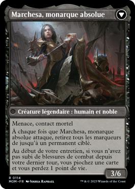 Menace, contact mortel À chaque fois que Marchesa, monarque absolue attaque, retirez tous les marqueurs de jusqu'à un permanent ciblé. Au début de votre entretien, si vous n'avez pas subi de blessures de combat depuis votre dernier tour, vous piochez une carte et vous perdez 1 point de vie.