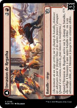 (Au moment où un siège arrive sur le champ de bataille, choisissez un adversaire pour le protéger. Vous et les autres pouvez l'attaquer. Quand il est vaincu, exilez-le, puis lancez-le transformé.) Quand l'Invasion de Regatha arrive sur le champ de bataille, elle inflige 4 blessures à une autre bataille ciblée ou à un adversaire ciblé, et 1 blessure à jusqu'à une créature ciblée.