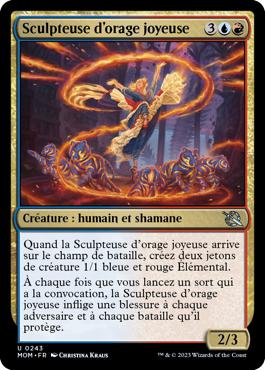 Quand la Sculpteuse d'orage joyeuse arrive sur le champ de bataille, créez deux jetons de créature 1/1 bleue et rouge Élémental. À chaque fois que vous lancez un sort qui a la convocation, la Sculpteuse d'orage joyeuse inflige une blessure à chaque adversaire et à chaque bataille qu'il protège.