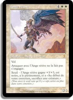 Seuil – l'Ange rétive gagne +3/+3, est noire, a le piétinement, et a « Au début de votre entretien, sacrifiez une créature. » (Vous avez le seuil tant qu'il y a sept cartes ou plus dans votre cimetière.)