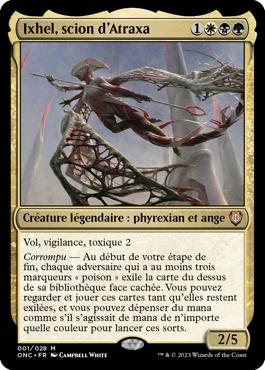 Vol, vigilance, toxique 2 Corrompu — Au début de votre étape de fin, chaque adversaire qui a au moins trois marqueurs « poison » exile la carte du dessus de sa bibliothèque face cachée. Vous pouvez regarder et jouer ces cartes tant qu'elles restent exilées, et vous pouvez dépenser du mana comme s'il s'agissait de mana de n'importe quelle couleur pour lancer ces sorts.