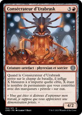 • Quand le Consécrateur d'Urabrask arrive sur le champ de bataille, il inflige X blessures à n'importe quelle cible, X étant le nombre de permanents que vous contrôlez avec des marqueurs « pétrole » sur eux.
