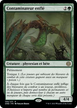 Piétinement Toxique 1 (Les joueurs qui subissent des blessures de combat de cette créature gagnent aussi un marqueur « poison ».) À chaque fois que le Contaminateur enflé inflige des blessures de combat à un joueur, proliférez. (Choisissez n'importe quel nombre de permanents et/ou de joueurs, puis donnez-leur à chacun un autre marqueur de chaque sorte déjà présente.)
