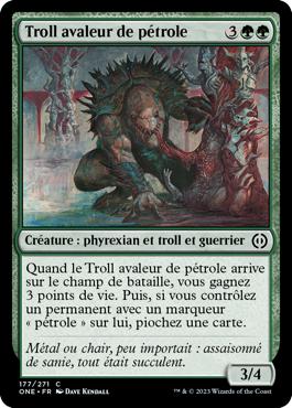 • Quand le Troll avaleur de pétrole arrive sur le champ de bataille, vous gagnez 3 points de vie. Puis, si vous contrôlez un permanent avec un marqueur « pétrole » sur lui, piochez une carte.