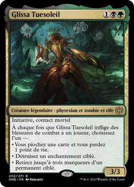 Initiative, contact mortel À chaque fois que Glissa Tuesoleil inflige des blessures de combat à un joueur, choisissez l'un — • Vous piochez une carte et vous perdez 1 point de vie. • Détruisez un enchantement ciblé. • Retirez jusqu'à trois marqueurs d'un permanent ciblé.