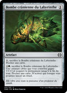 , sacrifiez la Bombe crânienne du Labyrinthe : Une créature ciblée que vous contrôlez gagne +3/+3 et acquiert le piétinement jusqu'à la fin du tour. Piochez une carte. N'activez que lorsque vous pourriez lancer un rituel.