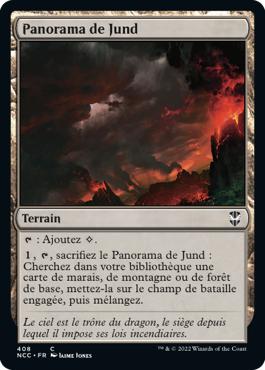 , sacrifiez le Panorama de Jund : Cherchez dans votre bibliothèque une carte de marais, de montagne ou de forêt de base, mettez-la sur le champ de bataille engagée, puis mélangez.