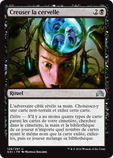 L'adversaire ciblé révèle sa main. Choisissez-y une carte non-terrain et exilez cette carte. Délire — S'il y a au moins quatre types de carte parmi les cartes de votre cimetière, cherchez dans le cimetière, la main et la bibliothèque de ce joueur n'importe quel nombre de cartes ayant le même nom que la carte exilée, exilez-les, puis ce joueur mélange sa bibliothèque.