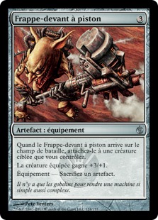 • Quand le Frappe-devant à piston arrive sur le champ de bataille, attachez-le à une créature ciblée que vous contrôlez.La créature équipée gagne +3/+1.
