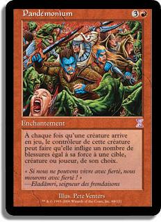 If player A controls Pandemonium when a creature enters the battlefield under player B's control, player A controls the triggered ability even though player B chooses the target and chooses whether to have the creature deal damage, which could be important if multiple abilities controlled by multiple players trigger. [2006-09-25]