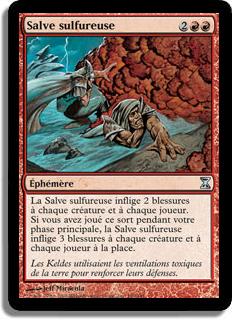 • La Salve sulfureuse inflige 2 blessures à chaque créature et à chaque joueur. Si vous avez joué ce sort pendant votre phase principale, la Salve sulfureuse inflige 3 blessures à chaque créature et à chaque joueur à la place.