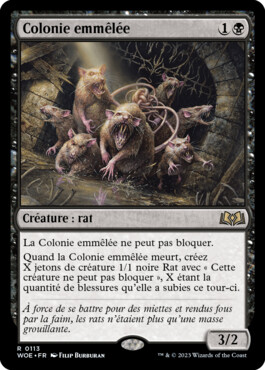 Quand la Colonie emmêlée meurt, créez X jetons de créature 1/1 noire Rat avec « Cette créature ne peut pas bloquer », X étant la quantité de blessures qu'elle a subies ce tour-ci.