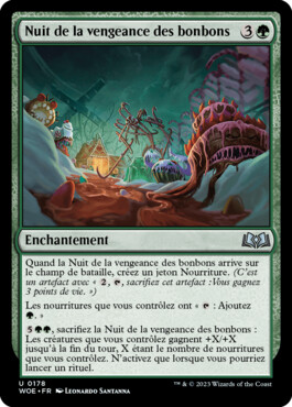 , sacrifiez la Nuit de la vengeance des bonbons : Les créatures que vous contrôlez gagnent +X/+X jusqu'à la fin du tour, X étant le nombre de nourritures que vous contrôlez. N'activez que lorsque vous pourriez lancer un rituel.