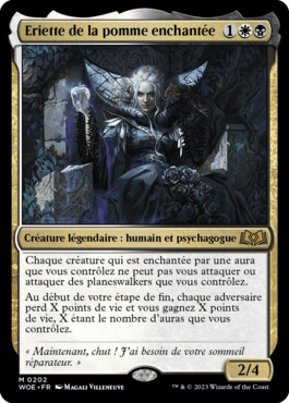 Chaque créature qui est enchantée par une aura que vous contrôlez ne peut pas vous attaquer ou attaquer des planeswalkers que vous contrôlez. Au début de votre étape de fin, chaque adversaire perd X points de vie et vous gagnez X points de vie, X étant le nombre d'auras que vous contrôlez.