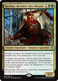• Reyhan, dernière des Abzans arrive sur le champ de bataille avec trois marqueurs +1/+1 sur elle.