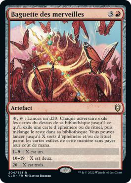 : Lancez un d20. Chaque adversaire exile les cartes du dessus de sa bibliothèque jusqu'à ce qu'il exile une carte d'éphémère ou de rituel, puis mélange le reste dans sa bibliothèque. Vous pouvez lancer jusqu'à X sorts d'éphémère et/ou de rituel parmi les cartes exilées de cette manière sans payer leur coût de mana.