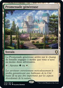 • La Promenade généreuse arrive sur le champ de bataille engagée à moins que vous n'ayez au moins deux adversaires.
