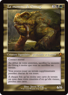 Contact mortel Au début de votre entretien, sacrifiez Le monstre de Gitrog à moins que vous ne sacrifiiez un terrain. Vous pouvez jouer un terrain supplémentaire pendant chacun de vos tours. À chaque fois qu'au moins une carte de terrain est mise dans votre cimetière d'où qu'elle vienne, piochez une carte.