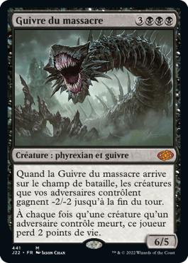• Quand la Guivre du massacre arrive sur le champ de bataille, les créatures que vos adversaires contrôlent gagnent -2/-2 jusqu'à la fin du tour.