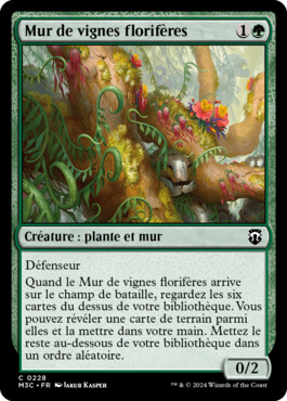Quand le Mur de vignes florifères arrive sur le champ de bataille, regardez les six cartes du dessus de votre bibliothèque. Vous pouvez révéler une carte de terrain parmi elles et la mettre dans votre main. Mettez le reste au-dessous de votre bibliothèque dans un ordre aléatoire.