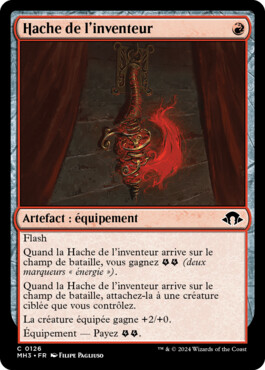 Flash Quand la Hache de l'inventeur arrive sur le champ de bataille, vous gagnez {e}{e} (deux marqueurs « énergie »). Quand la Hache de l'inventeur arrive sur le champ de bataille, attachez-la à une créature ciblée que vous contrôlez. La créature équipée gagne +2/+0. Équipement — Payez {e}{e}.