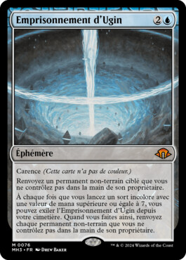 Carence (Cette carte n'a pas de couleur.) Renvoyez un permanent non-terrain ciblé que vous ne contrôlez pas dans la main de son propriétaire. À chaque fois que vous lancez un sort incolore avec une valeur de mana supérieure ou égale à 7, vous pouvez exiler l'Emprisonnement d'Ugin depuis votre cimetière. Quand vous faites ainsi, renvoyez chaque permanent non-terrain que vous ne contrôlez pas dans la main de son propriétaire.