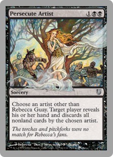 • Choose an artist other than Rebecca Guay. Target player reveals his or her hand and discards all nonland cards by the chosen artist.